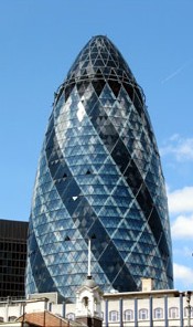 30 St Mary's Axe, London; affectionatly nicknamed "The Gherkin" A fully glass clad building (2003) |